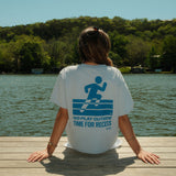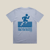 An easy-wearing tee designed for real life: movement, travel, slow mornings, and long walks. The light blue base gets a small “It’s Time For Recess” hit at the chest and a graphic back print that reads “Go Play Outside – Time For Recess,” a reminder to log off and get some air. The fit is relaxed but polished, so it pairs just as well with jeans or trousers as it does with a pleated skirt or bike shorts.